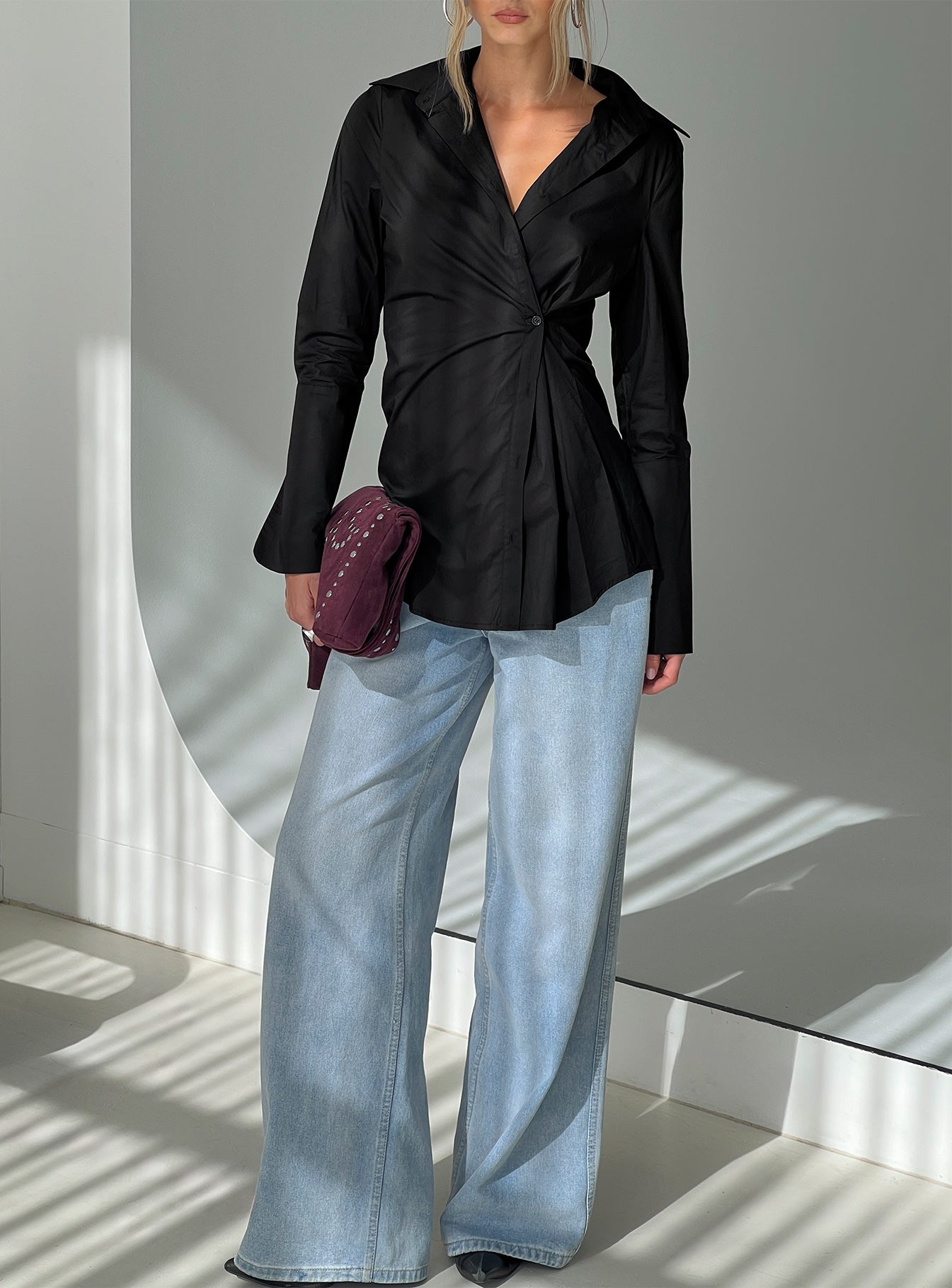 • Collared, button-up closure, side button detail, triple-button cuff, tie at back, oversized