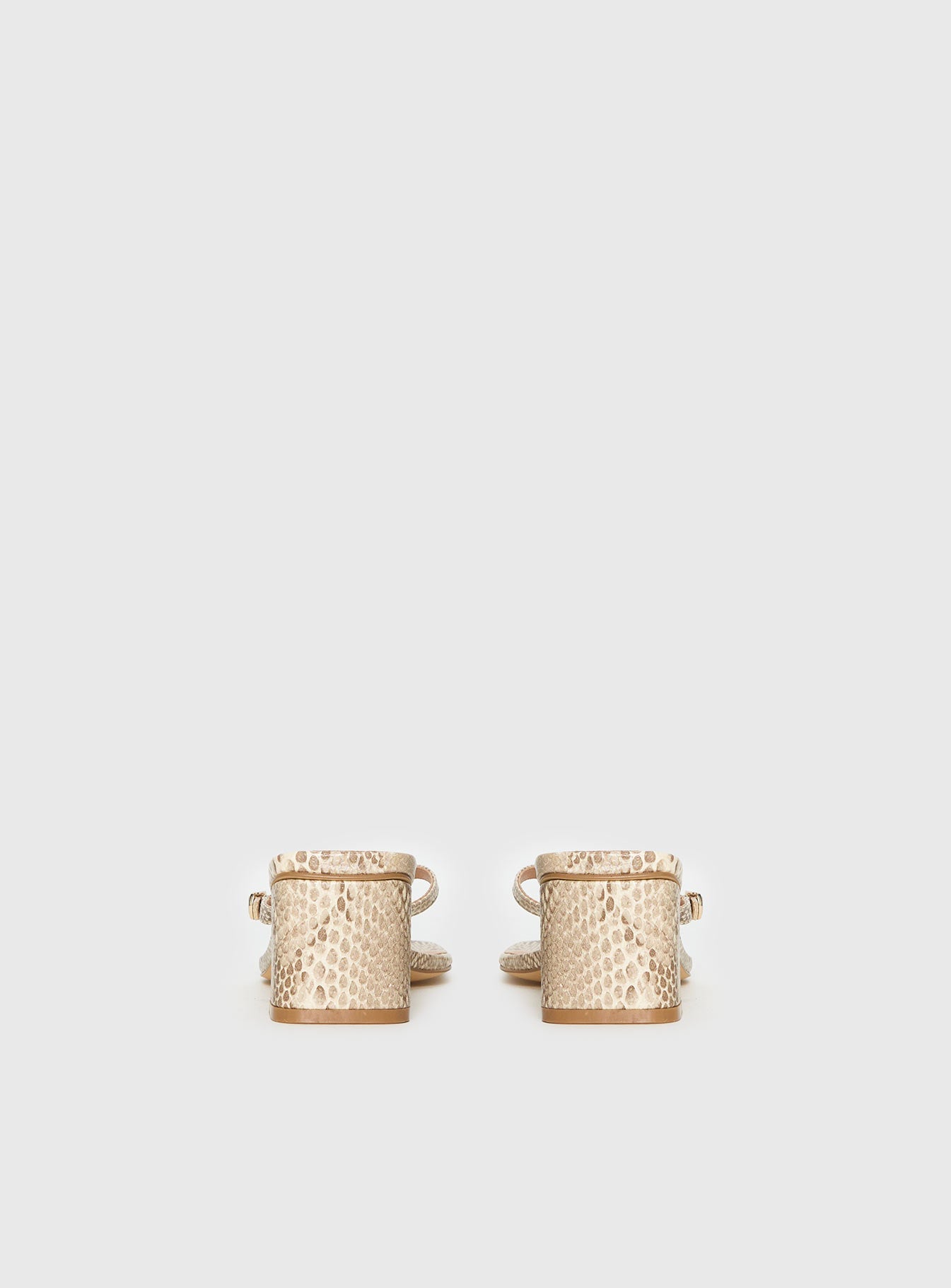 • Snake print, slip-on style, buckle detail, gold-toned hardware, open toe & back