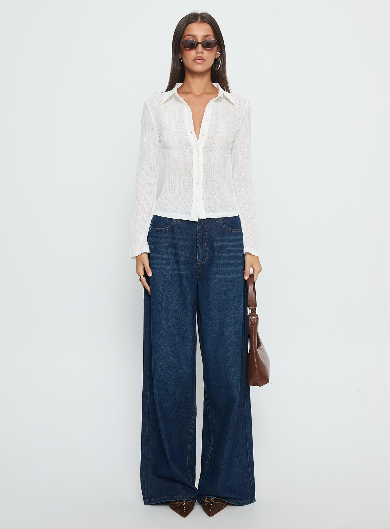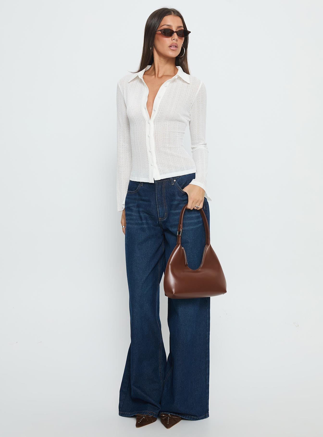 • Classic collar, button closure, flared cuffs, sheer, textured fabric